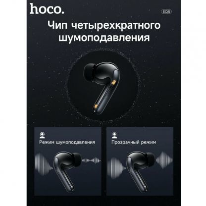 Внутри беспроводных наушников Hoco EQ5 установлен чип JL AC7006A8 для бесперебойного соединения по Bluetooth 5.3. Они представляют собой наушники закрытого типа, полностью погружающие вас в звук и частично изолирующие от внешних шумов, даже без активного шумоподавления. Hoco EQ5 предоставляют режимы активного шумоподавления и режим прозрачности, которые обеспечивают уникальный опыт прослушивания. Кроме того, 13-миллиметровый динамик гарантирует мощные и насыщенные басы, и великолепное качество звука на всем частотном диапазоне.