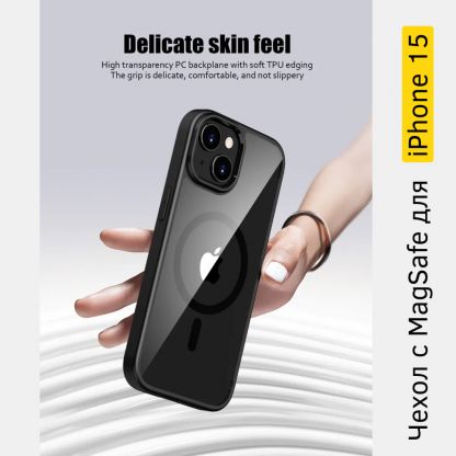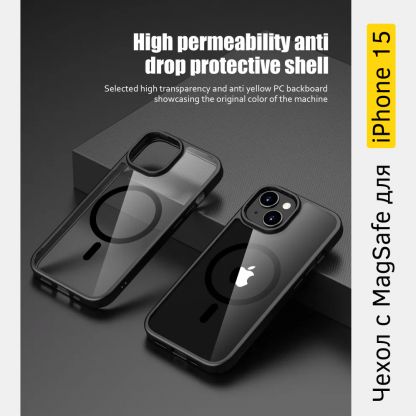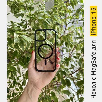 Прозрачный чехол с MagSafe с черными рамками для смартфона iPhone 15. Противоударный. Благодаря утолщениям по контуру, защищает камеры и экран устройства.
