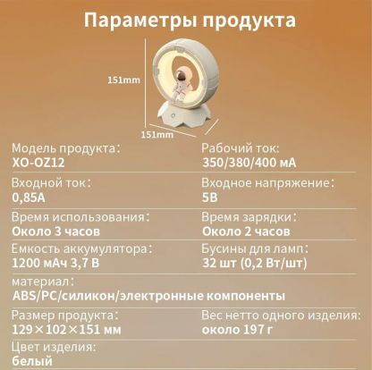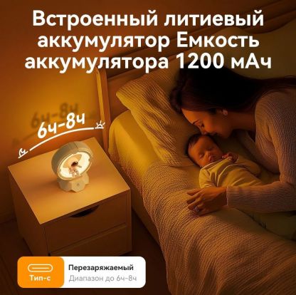Этот ночник функционирует на базе встроенного аккумулятора, обеспечивая длительное использование без проводов. Устройство создает атмосферу волшебства и теплоты.