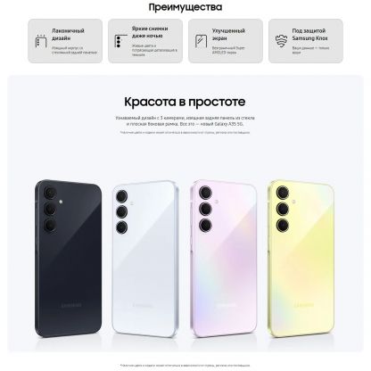 Смартфон поддерживает сети 5G, оснащен стереодинамиками, подэкранным сканером отпечатков пальцев и модулем NFC для бесконтактных платежей. Однако разъем 3,5 мм для наушников отсутствует.SGSmartSamsung Galaxy A35 предлагает сбалансированные характеристики, подходящие для пользователей, ищущих надежный смартфон с современными функциями по разумной цене.