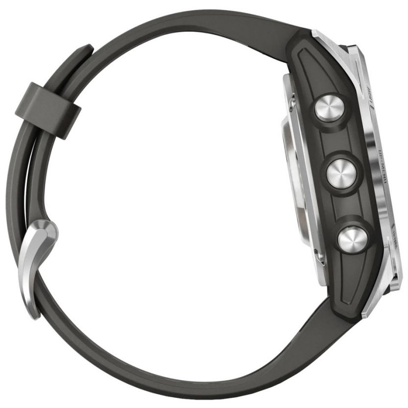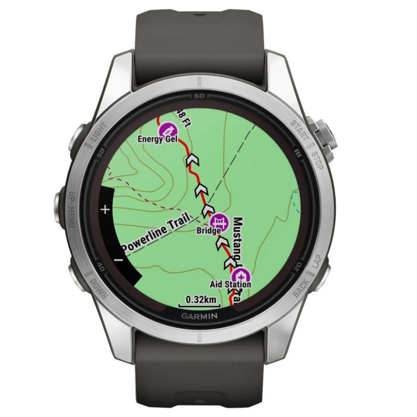 Поверх дисплея тут установлено защитное стекло Garmin Power Glass или Power Sapphire, которое не только защищает экран от повреждений, но и поддерживает солнечную подзарядку, продлевая впечатляющее время автономной работы. Достаточно просто чаще находиться под солнцем — и ваши часы будут заряжаться прямо во время активности.